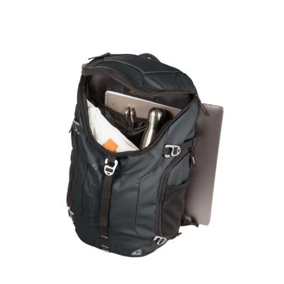Der Rucksack verfügt über ein Rückenfach mit seitlichem Eingriff zum gepolstertem Laptopfach (max. 13 Zoll). Zudem hat der Walker ein Hauptfach mit Organizer und ein extra Netzfach in der Klappe. Seitlich gibt es elastische Seitentaschen für Getränkeflaschen. Der Organizer verfügt über eine Zippnetztasche, ein Steckfach, Steckplätze für Stifte sowie einen Karabiner. Die atmungsaktive Rückenpolsterung, die ergonomisch geformten und atmungsaktiven Schulterriemen, der verstellbaree Brustgurt, sowie die Kompressionsriemen schaffen ein komfortables Tragegefühl.