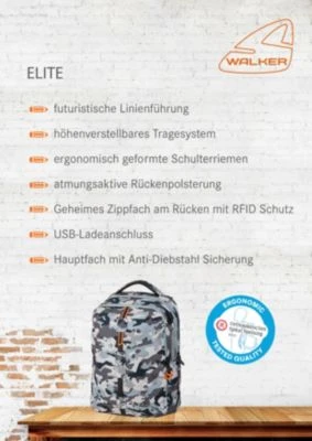 Höhenverstellbares Tragesystem; Ergonomisch geformte Schulterriemen; Atmungsaktive Rückenpolsterung; Hühenverstellbarer Brustgurt; Seitentaschen für Getränkeflachen; Geheimes Zippfach am Rucksackrücken mit RFID Schutz; Abnehmbarer Hüftgurt für optimale Gewichtsverteilung 600D Polyester 32*46*23cm