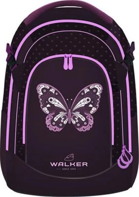 Walker Schulrucksack Fame 2.0 Purple Butterfly; Erweiterte Rückenpolsterung; Zusätzliche Polsterung der Schulterriemen für zusätzlichen Komfort; Kompressionsriemen für verbesserte Lastenverteilung; Modernisierte Form des Tragegriffs; Elastische, flach anliegende Seitentaschen für eine schmale Optik; Stickerei Applikationen, Pailetten, 3D Rubber Printing und Quasten (tassels) Polyester
